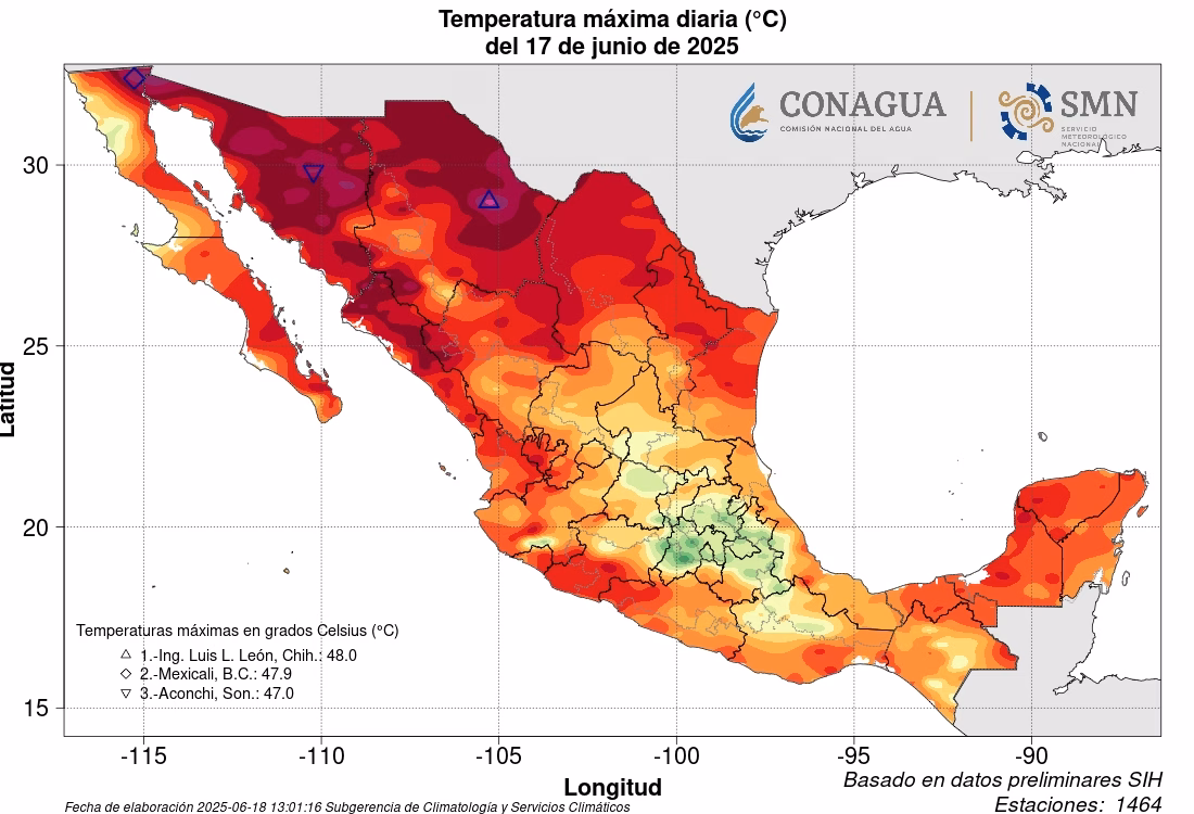 Para el lunes 16 de junio, Aconchi quedó en segundo lugar nacional con 48 grados, de nuevo solo superado por Mexicali que alcanzó los 50 grados.