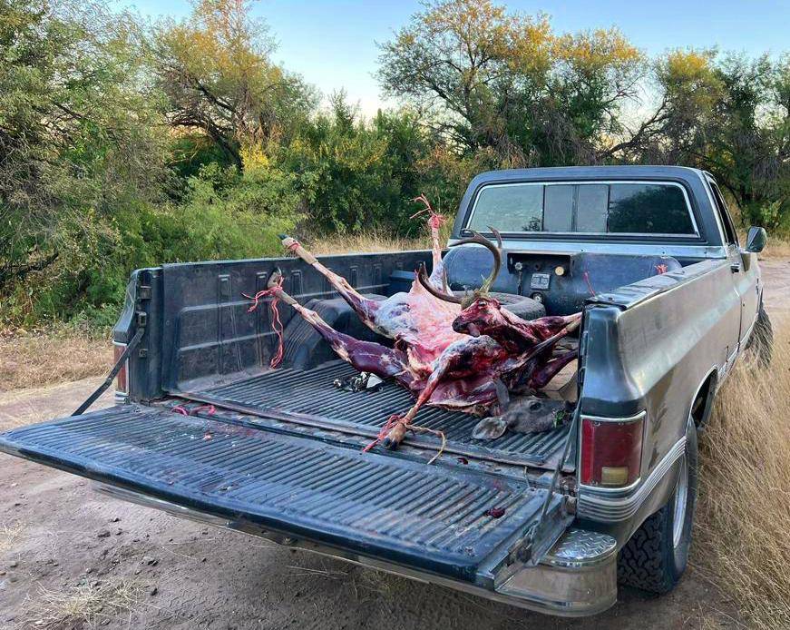 Detectaron dos vehículos en circulación por la zona, un pick up Chevrolet, color gris, modelo atrasado, donde transportaban los venados cola blanca sin vida, un macho con cornamenta de seis puntas y una hembra sin astas.