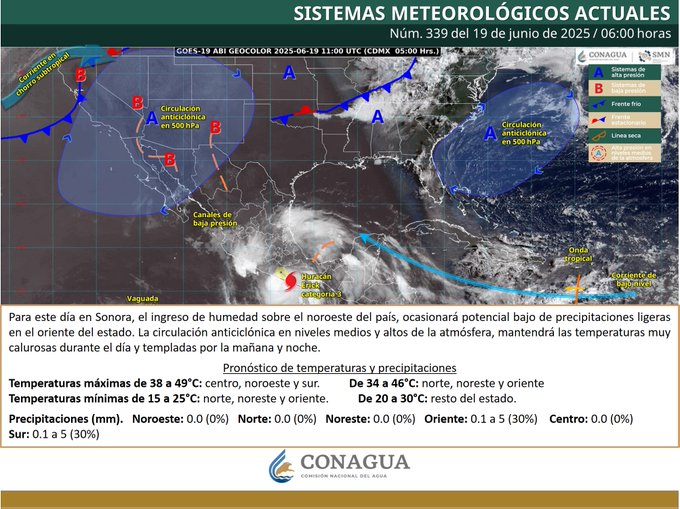 El jefe de Metereología de la Comisión Nacional del Agua (CONAGUA), anunció por medio de la platarforma de X que el ingreso de humedad sobre el noroeste del país, ocasionará potencial bajo de precipitaciones ligeras en el oriente del estado. La circulación anticiclónica , mantendrá las temperaturas muy calurosas durante el día y templadas por la mañana y noche.