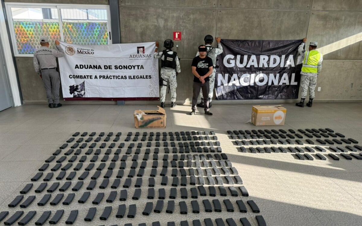 Agentes de la Guardia Nacional, en la frontera de Sonora, detuvieron a una persona en posesión de 300 cargadores para fusil de asalto, que serían entregados a la delincuencia.