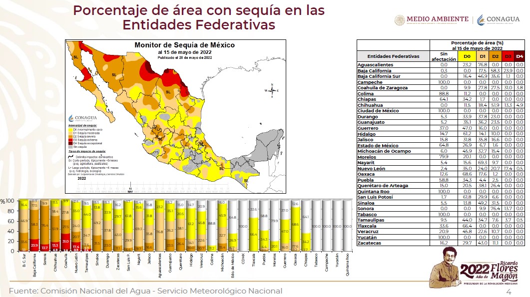 Según el Monitoreo de Sequía el 100% del territorio de Sonora se está viendo afectado en estos momentos, hablando de dos municipios en Sequía Moderada, que son Arivechi y Onavas, otros 53 municipios están en Sequía Severa, que es el 76.4% del estado, y 17 municipios en extrema, que es el 13.7% de Sonora.