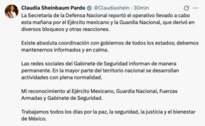“Debemos mantenernos informados y en calma”, expresó la presidenta Claudia Sheinbaum tras los hechos de violencia registrados en Jalisco, luego del operativo del Ejército Mexicano y la Guardia Nacional que derivó en bloqueos y otras reacciones.
