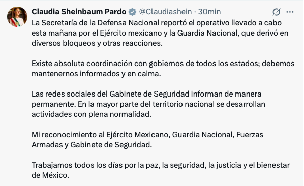 El Gobierno federal reiteró que en la mayor parte del territorio nacional las actividades se desarrollan con normalidad y que se mantiene coordinación permanente para garantizar la seguridad de la población.