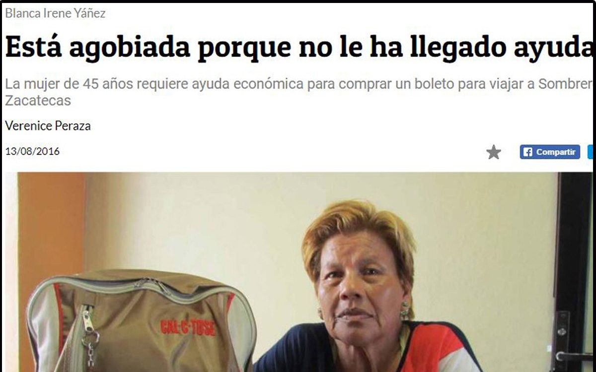 Esto luego de que algunos ciudadanos denunciaron a través de redes sociales el modus operandi que esta mujer (Blanca Irene), ha realizado en diferentes ciudades del país, la cual consiste en solicitar ayuda a las personas diciendo que fue abandonada por familiares y que necesita urgentemente regresar a El Sombrerete, Zacatecas.
