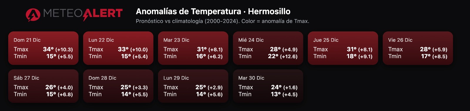 Hermosillo, Sonora, 22 de Diciembre, 2025.- Datos oficiales de la estación meteorológica de MeteoAlert confirman que este podría ser el invierno más cálido en Hermosillo en los últimos 30 años.