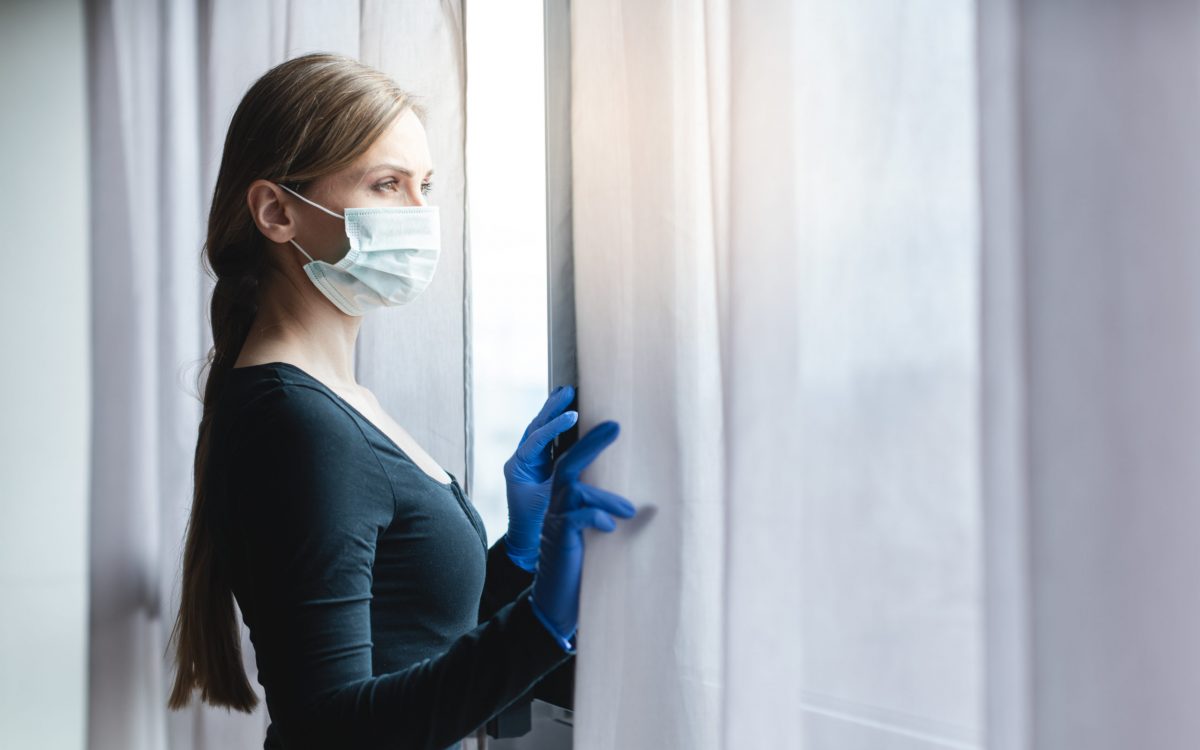 Bored woman in corona quarantine looking out of window to the street