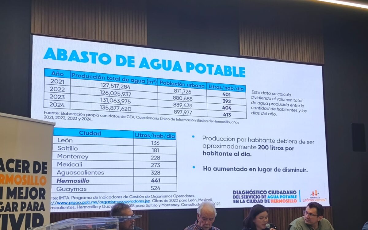 El coordinador de la Mesa temática de Agua de la asociación Hermosillo ¿Cómo Vamos?, Nicolas Pineda Pablos, presentó su estudio llamado “Diagnostico Ciudadano del Servicio de Agua en la Ciudad de Hermosillo 2021-2024”, donde analiza la eficiencia del organismo operador en la ciudad, quien presenta importantes fallas en medición, eficiencia física y comercial y está en déficit financiero.