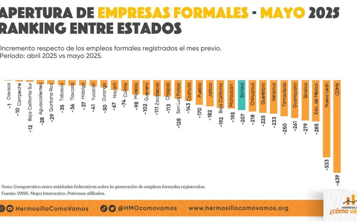 Cabe resaltar que el último mes Sonora registró una recuperación en el apartado de empleos formales. Tras haber anotado la pérdida de 12,175 empleos en abril, en mayo se recuperó con 1,147 nuevos empleos.