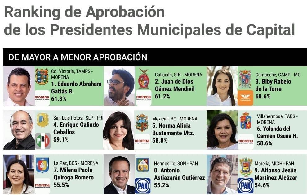 En julio, de acuerdo también a México Elige, Toño Astiazarán se ubicó en el lugar 19 en la evaluación de alcaldes de capitales del país, con una calificación de 50.4%, lo que significa que en un mes escaló 11 posiciones y avanzó casi 5 puntos porcentuales de manera positiva.