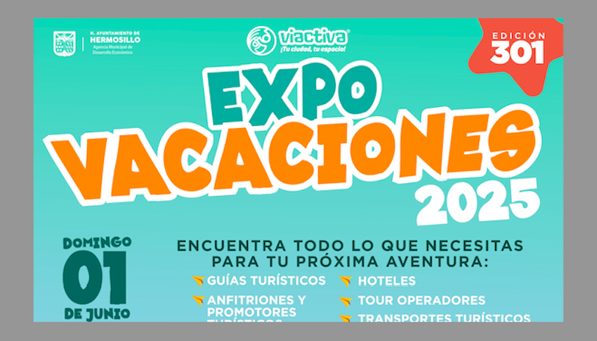Aprovechando las campañas del Hot Sale y la estrategia nacional para promocionar el turismo llamado “La Gran Escapada”, las empresas sonorenses que ofrecen tours se congregarán en la Plaza Zaragoza, en la vía Activa, para realizar la primera Expo Vacaciones 2025.