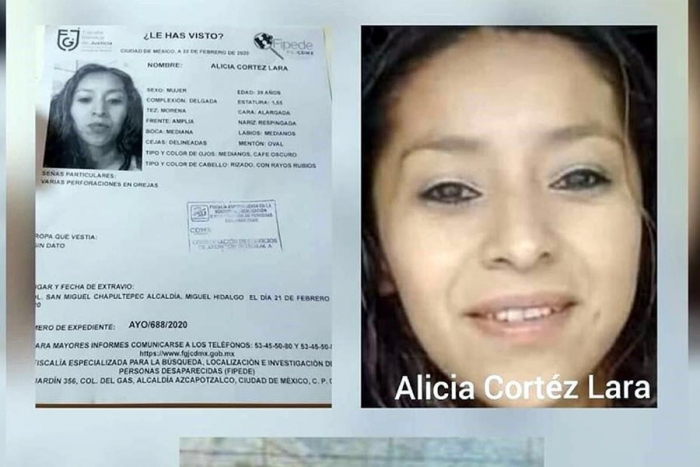 Ocho días después de denunciarse su desaparición en la demarcación de Miguel Hidalgo, fue encontrado el cuerpo de Alicia Cortés Lara dentro de una cisterna de un inmueble ubicado en la colonia Hogares Mexicanos, en el municipio de Ecatepec, estado de México.