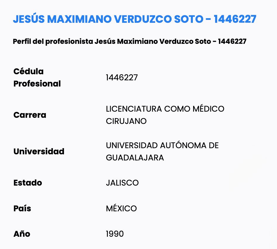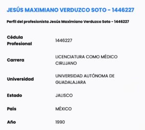 Jesús Maximiano ‘N’ estudió la licenciatura de médico cirujano en la Universidad Autónoma de Guadalajara y cuenta con cédula profesional vigente.
