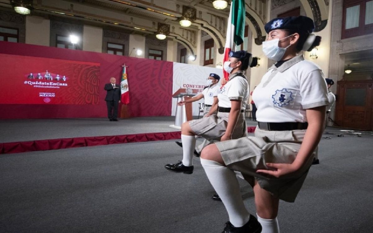 También con la presencia del secretario de Educación Pública (SEP), Esteban Moctezuma, el mandatario entonó el Himno Nacional en Palacio Nacional frente a una escolta de jóvenes que, con cubrebocas, resguardaron el lábaro patrio.