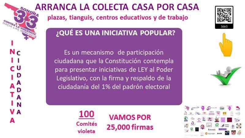 Para esto, realizan la invitación que sigan las redes sociales de la Observatoria todas MX-Sonora, donde estarán informando en que plazas , escuelas y ciudades estarán recabando las firmas, para lo cual ya integraron 100 comités violetas que se encargarán de este proceso.