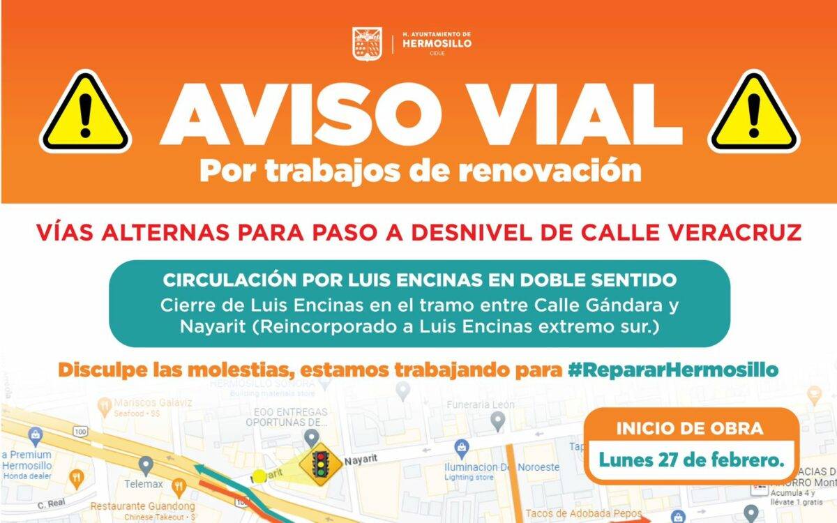Además, este lunes 27 de febrero iniciarán los trabajos de modernización del paso a desnivel en la intersección del bulevar Luis Encinas con la avenida Veracruz.
