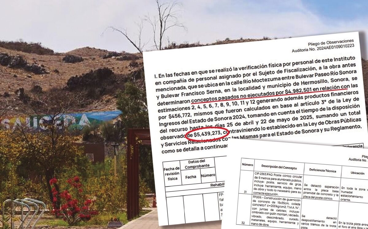 Y la observación “2024AE223FN1010”, donde se revisó la partida “61211 – Infraestructura y Equipamiento en Materia de Cultura, Deporte y Recreación», donde se detectó que en las obras de “Rehabilitación General de Parque La Sauceda, en Hermosillo, Sonora, Primer Etapa, Sección 1, 2 y 3″ hechas por JFN SA de CV, se solicitó un convenio de modificación para incrementar el montó en 33.2 millones de pesos, lo que representó un 25% más del monto original.