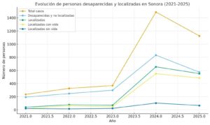 A la par, las cifras de personas desaparecidas en Sonora muestran un repunte preocupante. Según el Registro Nacional de Personas Desaparecidas y No Localizadas (RNPDNO):