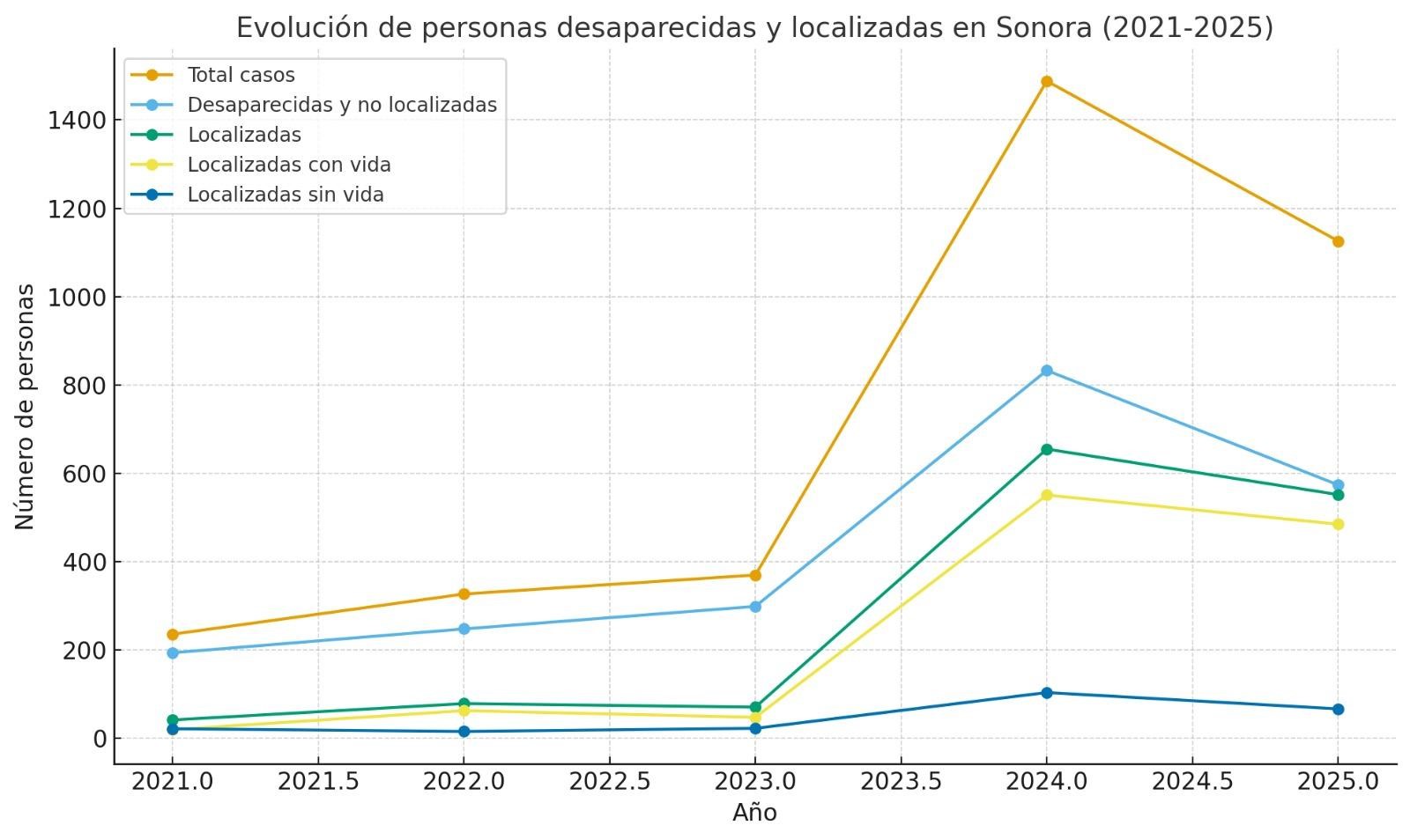 Dentro de estos casos, las personas desaparecidas y no localizadas pasaron de 194 en 2021, a 833 en 2024, mientras que las personas localizadas con vida crecieron de 20 a 551, y las localizadas sin vida de 22 a 104. Cada cifra representa una persona, una familia, un amigo; no son solo números.