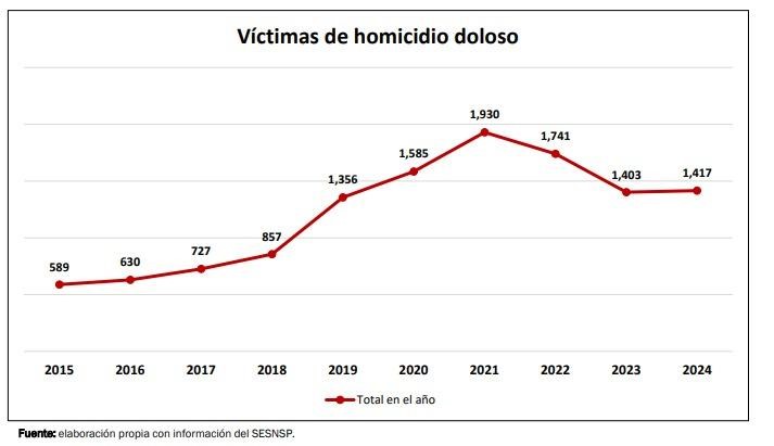 En 2023 continuó la baja a 1,403 víctimas, lo que equivale a un 19.5% menos que el año anterior. Sin embargo, en 2024 se produjo un ligero repunte, con 1,417 homicidios, un aumento de 1% respecto a 2023, lo que indica que la tendencia a la baja se estancó, aunque los niveles siguen siendo inferiores a los de 2021.