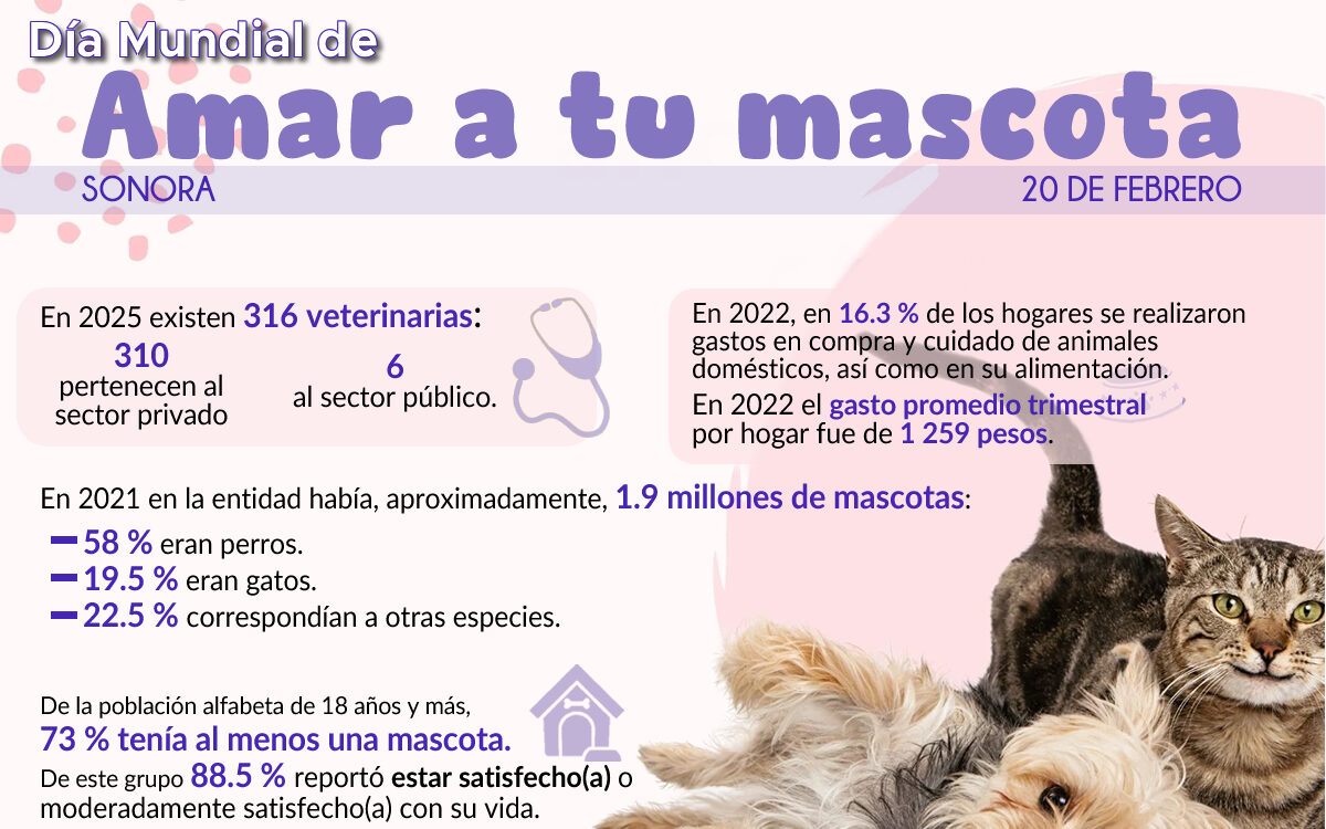 Este 20 de febrero se celebra el Día Mundial de Amar a las Mascotas y el INEGI presentó la estadística alrededor del tema, donde señaló que la mayoría de los Sonorenses prefieren tener de mascota a un perro que a los gatos y a otros animales.