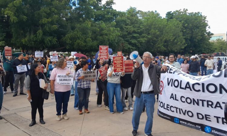 Integrantes del Sindicato de Trabajadores Académicos de la Universidad de Sonora (STAUS), se manifestaron este día en Hermosillo para exigir mejores prestaciones laborales y además garantías en seguridad al interior de los campus.