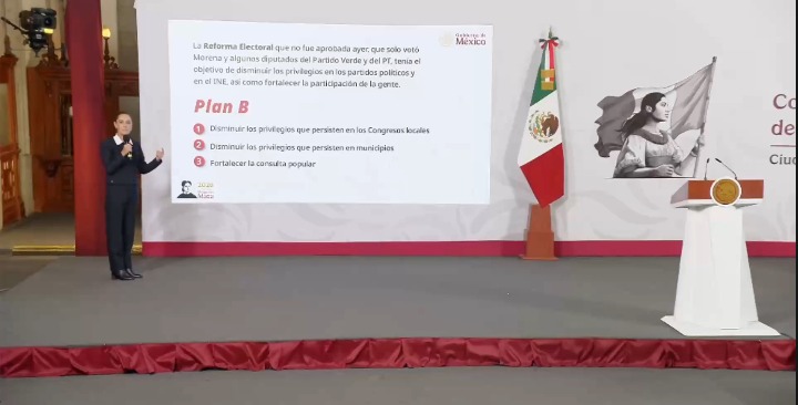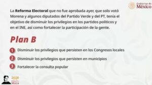Tras del rechazo a su reforma electoral en el Congreso, la presidenta Claudia Sheinbaum Pardo anunció que el próximo lunes enviará una iniciativa conocida como “Plan B”, con la cual buscará reducir los recursos destinados a congresos locales y municipios, además de ampliar mecanismos de consulta ciudadana en temas electorales.