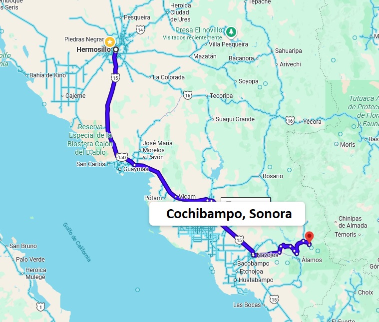Cochibampo (de Kowi, cerdo, y Bampo, en el agua) se ubica en el municipio de Álamos, a 38 kilómetros de la cabecera municipal y a menos de siete de la comisaría Los Tanques. Está rodeado por las comunidades de El Frijol, Munihuasa y Tescalama. A la comunidad la rodean algunas montañas con nombres típicos; además de La Pirinola, están La Albóndiga, El Picacho y El Tianamonte.