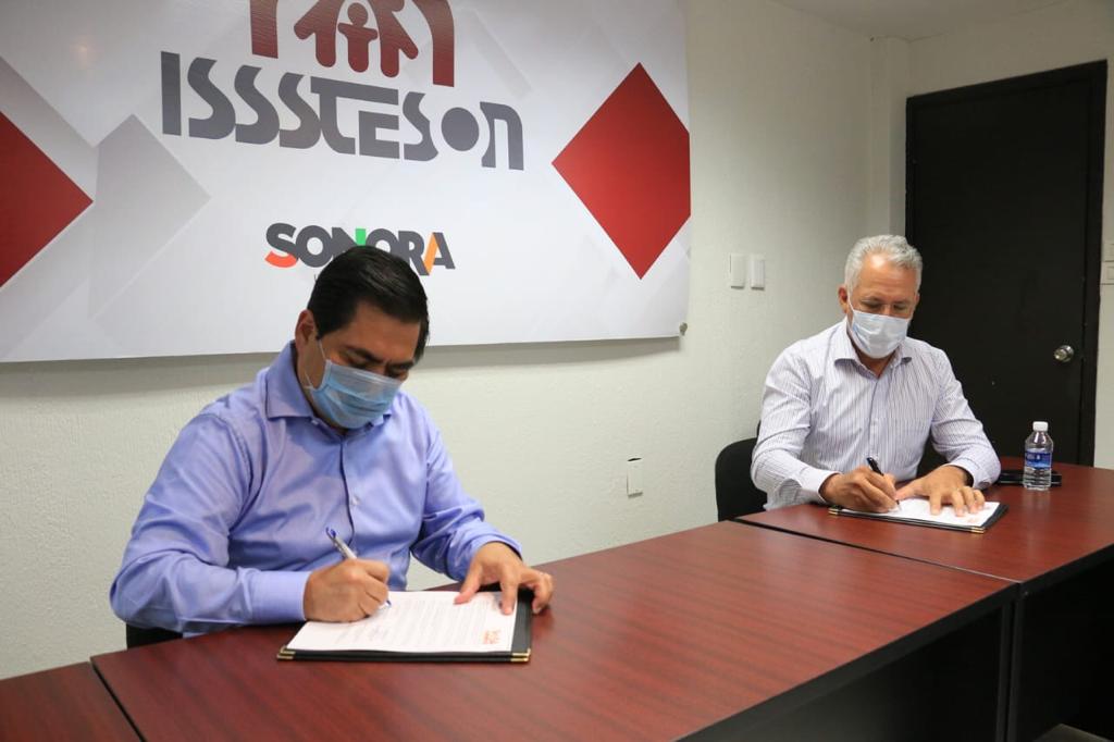 En beneficio de los derechohabientes del Isssteson ante la contingencia del Covid-19, Pedro Ángel Contretas, director general del instituto y Raymundo Lagarda Borbón, secretario general de la Sección 54 del SNTE, firmaron un convenio de colaboración.