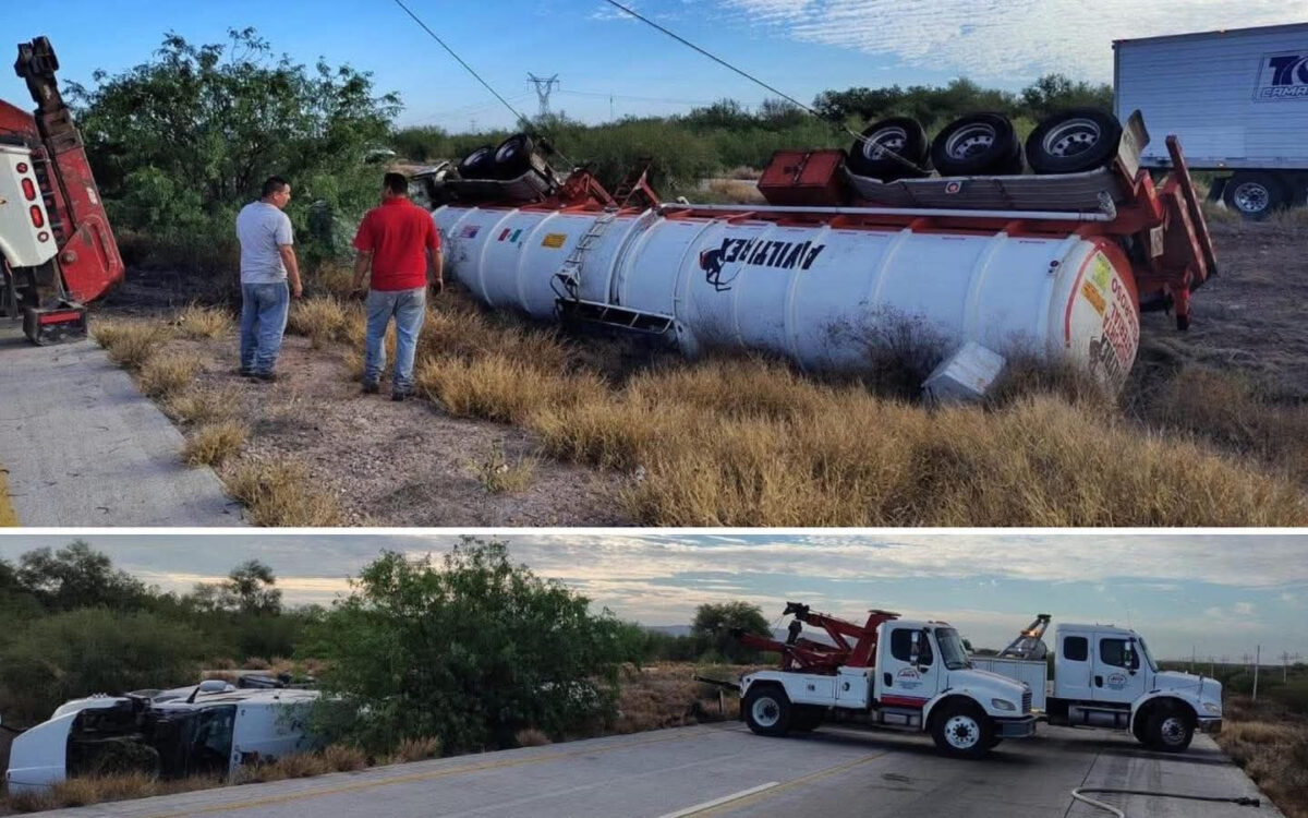 Un tráiler cisterna que transportaba combustóleo se volcó en la carretera México 15, a la altura de la caseta de peaje La Jaula, en Navojoa, Sonora.