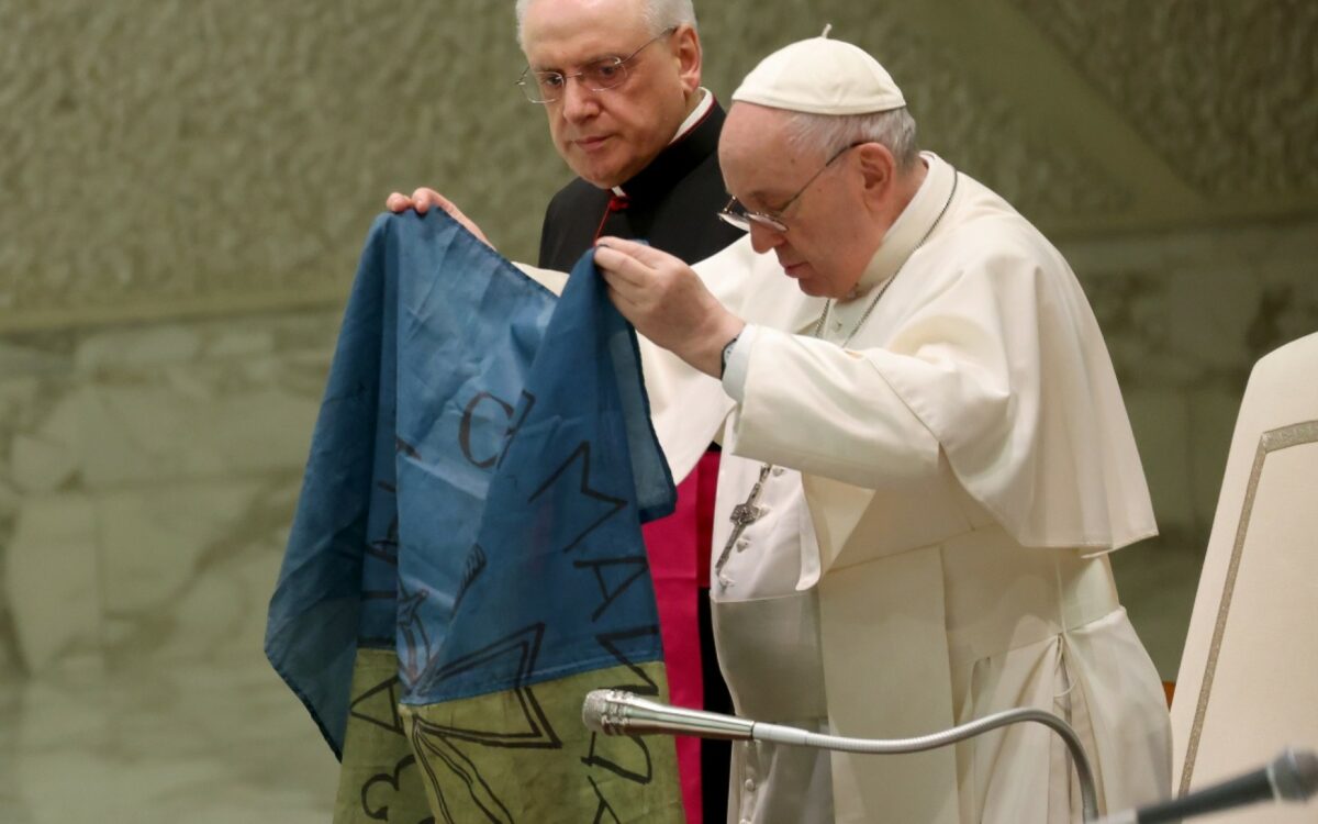 Papa Francisco besa bandera ucraniana