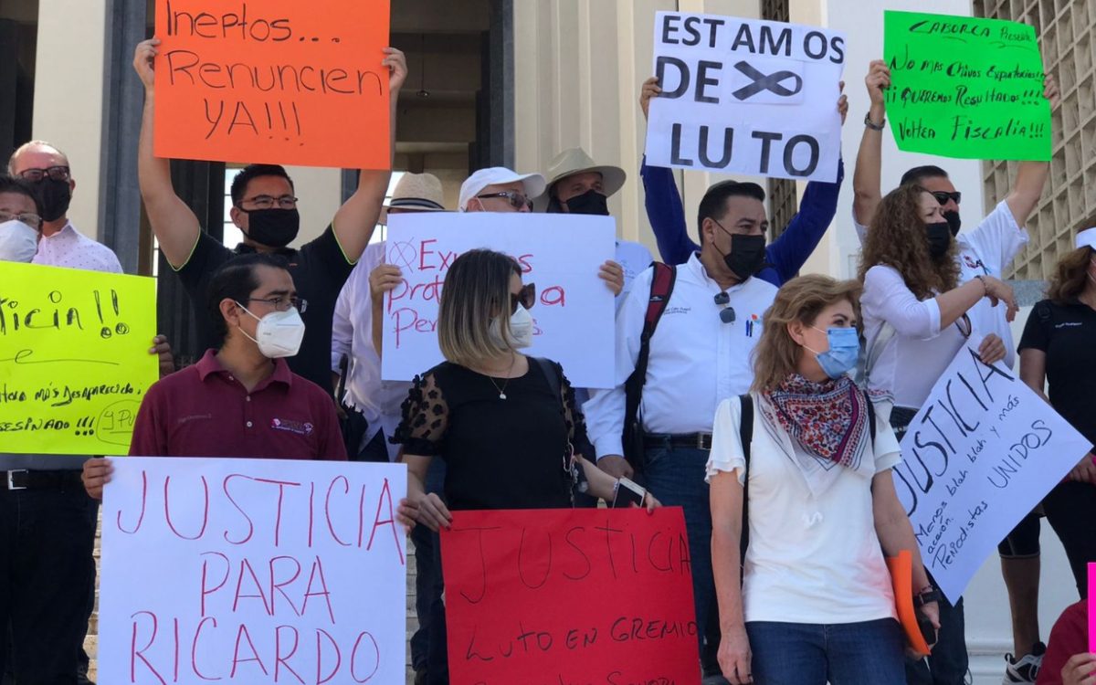 Decenas de colegas del fallecido director de InfoGuaymas marcharon por la avenida Rosales con rumbo a la Fiscalía con pancartas en mano, mismas que incluían mensajes como “Justicia por Ricardo”, “No más campañas de odio”, “Ineptos renuncien ya”.