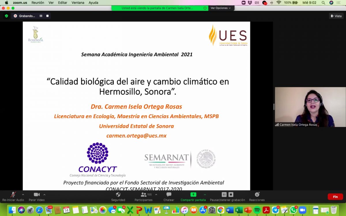 El 14 de abril el tema fue remediación ambiental del aire, con las conferencias “Calidad biológica del aire y cambio climático en Hermosillo, Sonora”, de Carmen Ortega Rosas (UES); “Calidad del aire en las comunidades fronterizas de Arizona y la colaboración binacional entre Sonora y Arizona”, de Joaquín Marrufo y Gerardo Monroy (Arizona Departament of Environmental Quality); “Contaminación del aire por hidrocarburos”, de Roberto Ramírez Leal (UES), quien también participa en el taller “Determinación de flujo gaseoso en ductos y chimeneas”, con Martín Cruz Campas (UES).