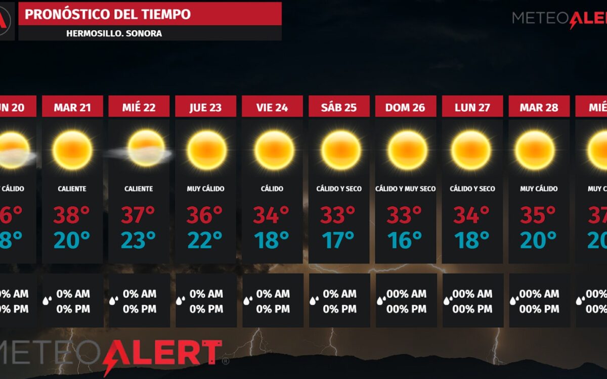 Hermosillo, Sonora, 20 de octubre, 2025.– El calor no da tregua, de acuerdo con el pronóstico de MeteoAlert, esta semana Hermosillo registrará temperaturas máximas cercanas a los 38 grados centígrados, particularmente entre martes y miércoles, manteniendo un ambiente muy cálido y seco en la capital sonorense.