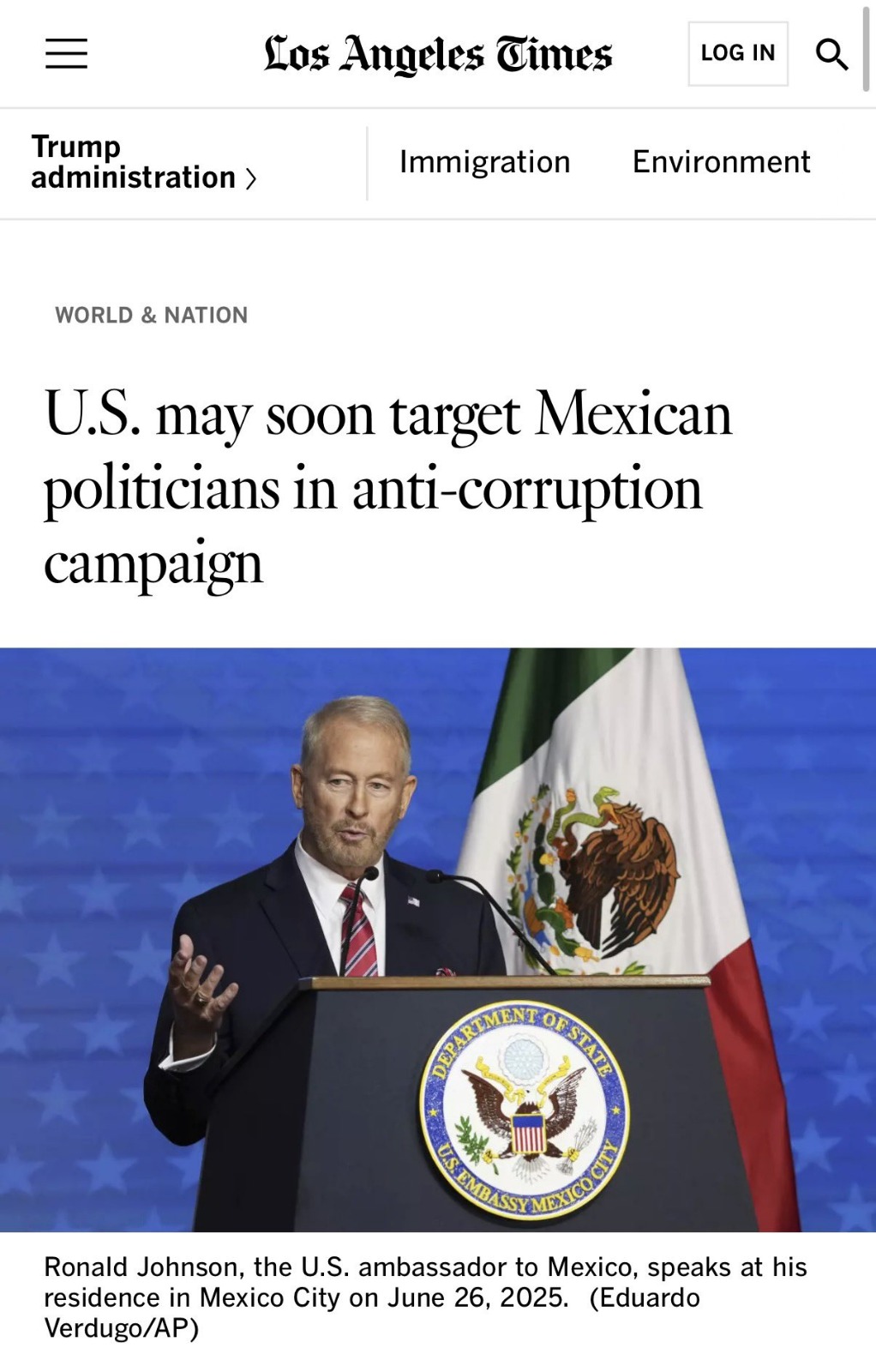 El artículo también señala que Estados Unidos ya ha aplicado sanciones como la revocación de visas a políticos mexicanos, entre ellos el gobernador de Sinaloa, Rubén Rocha Moya, quien ha rechazado los señalamientos.
