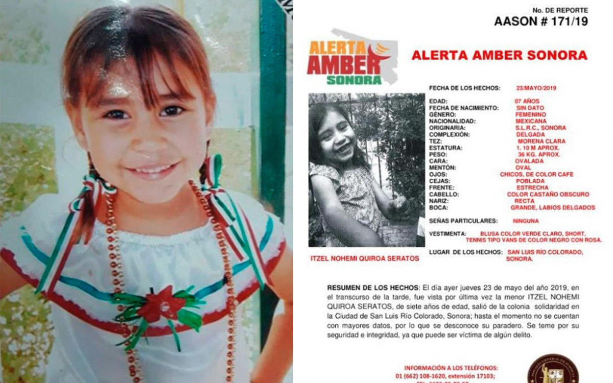 Desde el pasado jueves 23 de mayo, San Luis Río Colorado desapareció la niña Itzel Nohemí Quiroga Seratos, de 7 años de edad.