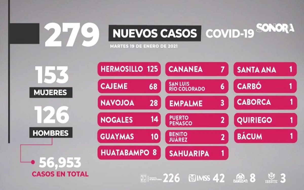 Asimismo los 279 nuevos casos de esta enfermedad se presentaron en 153 mujeres y 126 hombres, acumulándose un total de 56 mil 953; oriundos de Hermosillo (125), Cajeme (68), Navojoa (28), Nogales (14), Guaymas (10), Huatabampo (8), Cananea (7), San Luis Río Colorado (6), Empalme (3), Puerto Peñasco y Benito Juárez (2), Sahuaripa, Santa Ana, Carbó, Caborca, Quiriego y Bácum (1).