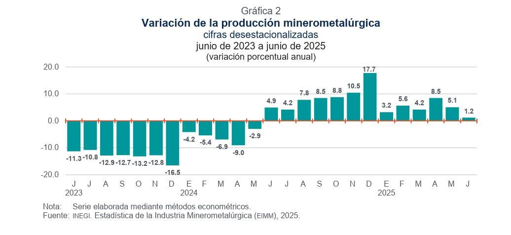 En el caso Sonora, en junio se registraron 45 mil 787 toneladas de cobre producidas, un aumento del 1.1% comparándolo con el mismo mes del 2024, y se mantiene en primer lugar nacional en este mineral.